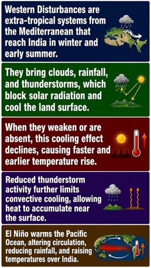 • This is linked to reduced western disturbances, lower thunderstorm activity, and residual warming effects from climatic phenomena such as El Niño.