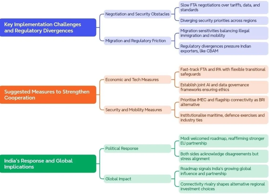 - The roadmap highlights regional connectivity initiatives such as the India-Middle East-Europe Economic Corridor (IMEC) and trilateral cooperation projects under the EU Global Gateway.