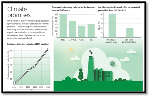 Paper: GS – III, Subject: Environment and Ecology, Topic: Indian Initiatives, Efforts and Commitments, Issue: India’s Climate Achievement in 2025.