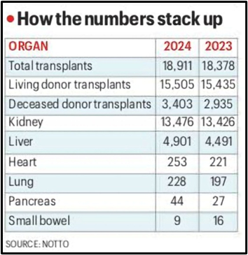 - India requires approximately 1.75 to 2 lakh kidneys annually, yet only 13,476 kidney transplants were performed in 2024.