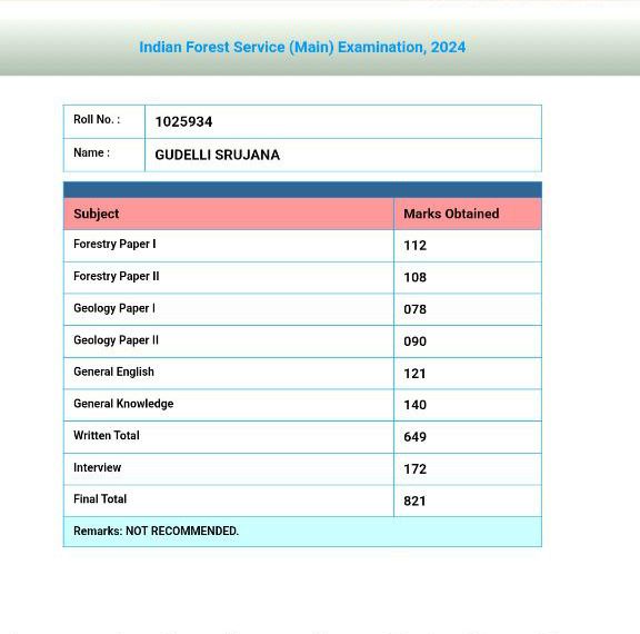 In the Indian Forest Service exam, she again missed the final list by 25 marks, even though she scored 172 marks in interview.